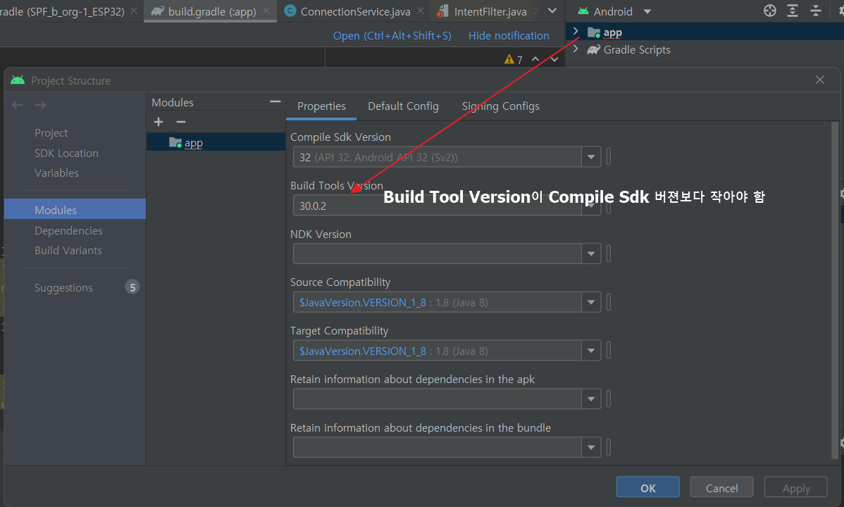 > Compile Sdk Version: 32로 , Build Tools Version: 지워도 됨(또는 Compile Sdk Version보다 작은 값으로)