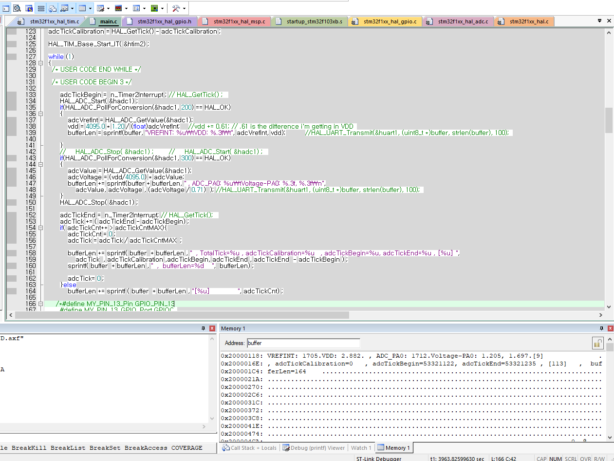 | /* Infinite loop */ /* USER CODE BEGIN WHILE */ adcTickCalibration = HAL_GetTick() ; while(HAL_ADCEx_Calibration_Start(&hadc1) != HAL_OK); //20240624 , ADC calibration , https://jeonhj.tistory.com/22 // while(HAL_ADCEx_Calibration_Start(&hadc2) != HAL_OK); //20240624 , ADC calibration , https://jeonhj.tistory.com/22 adcTickCalibration = HAL_GetTick() - adcTickCalibration ; HAL_TIM_Base_Start_IT( &htim2) ; while (1) { /* USER CODE END WHILE */ /* USER CODE BEGIN 3 */ adcTickBegin = n_Timer2Interrupt ; // HAL_GetTick() ; HAL_ADC_Start( &hadc1) ; if(HAL_ADC_PollForConversion(&hadc1, 200) == HAL_OK) { adcVrefInt = HAL_ADC_GetValue(&hadc1); vdd = 4095.0 * 1.20 / (float)adcVrefInt; //vdd += 0.61; // .61 is the difference i'm getting in VDD bufferLen = sprintf(buffer, "VREFINT: %u\tVDD: %.3f\t", adcVrefInt, vdd); //HAL_UART_Transmit(&huart1, (uint8_t *)buffer, strlen(buffer), 100); } // HAL_ADC_Stop( &hadc1) ; // HAL_ADC_Start( &hadc1) ; if(HAL_ADC_PollForConversion(&hadc1, 300) == HAL_OK) { adcValue = HAL_ADC_GetValue(&hadc1); adcVoltage = (vdd/4095.0) * adcValue; bufferLen += sprintf(buffer + bufferLen, " , ADC_PA0: %u\tVoltage-PA0: %.3f, %.3f\n", adcValue, adcVoltage , (adcVoltage / 0.71) ); //HAL_UART_Transmit(&huart1, (uint8_t *)buffer, strlen(buffer), 100); } HAL_ADC_Stop( &hadc1) ; adcTickEnd = n_Timer2Interrupt; // HAL_GetTick(); adcTick += ( adcTickEnd - adcTickBegin) ; if( adcTickCnt++ > adcTickCntMAX){ adcTickCnt = 0 ; adcTick = adcTick / adcTickCntMAX ; bufferLen += sprintf( buffer + bufferLen , " , TotalTick=%u , adcTickCalibration=%u , adcTickBegin=%u, adcTickEnd=%u , [%u] ", adcTick , adcTickCalibration ,adcTickBegin, adcTickEnd , adcTickEnd - adcTickBegin ) ; sprintf( buffer + bufferLen , " , bufferLen=%d ", bufferLen) ; adcTick= 0 ; }else bufferLen += sprintf ( buffer + bufferLen , "[%u] ", adcTickCnt) ; /*#define MY_PIN_13_Pin GPIO_PIN_13 #define MY_PIN_13_GPIO_Port GPIOC */ HAL_GPIO_WritePin( GPIOC, GPIO_PIN_13, GPIO_PIN_SET) ; HAL_Delay(500) ; HAL_GPIO_WritePin( GPIOC, GPIO_PIN_13, GPIO_PIN_RESET) ; HAL_Delay(500) ; // printf("Hello World") ; }//end of while /* USER CODE END 3 */ |