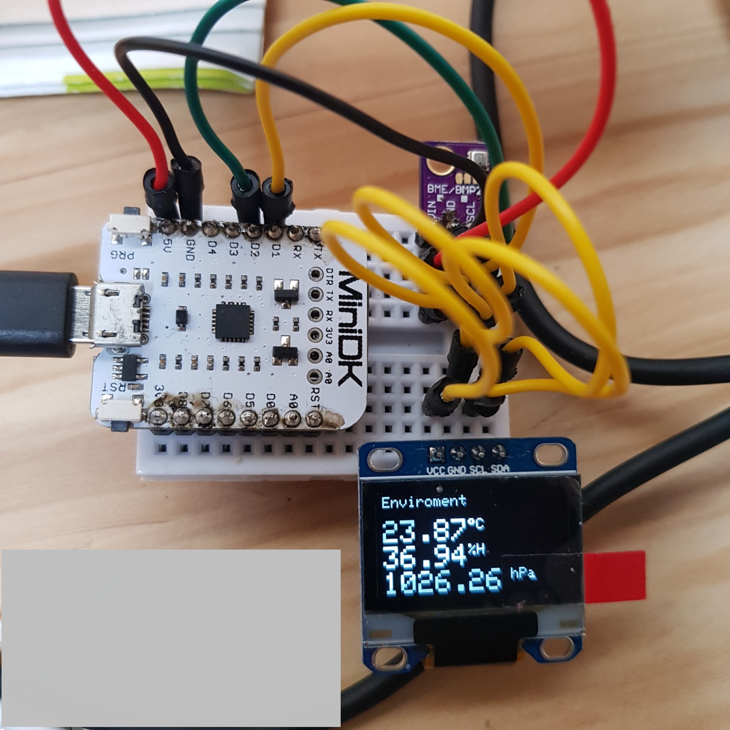 - 판매사이트의 사진 , MiniDK 보드와 BME280, OLED display 연결선을 보여줍니다(I2C)